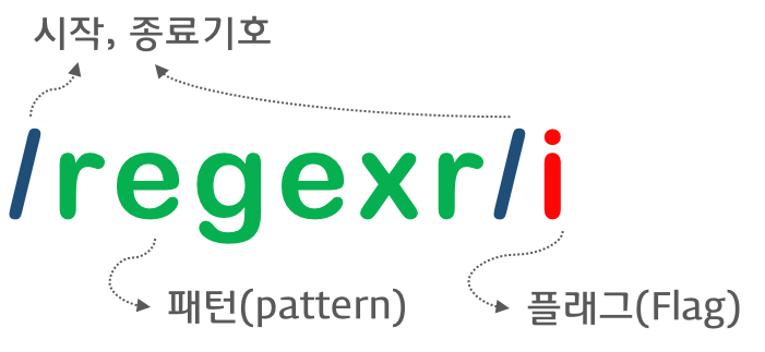 슬래쉬 문자 2개 사이로 정규식 기호가 들어가는 형태이다. 뒤의 i는 정규식 플래그이다.