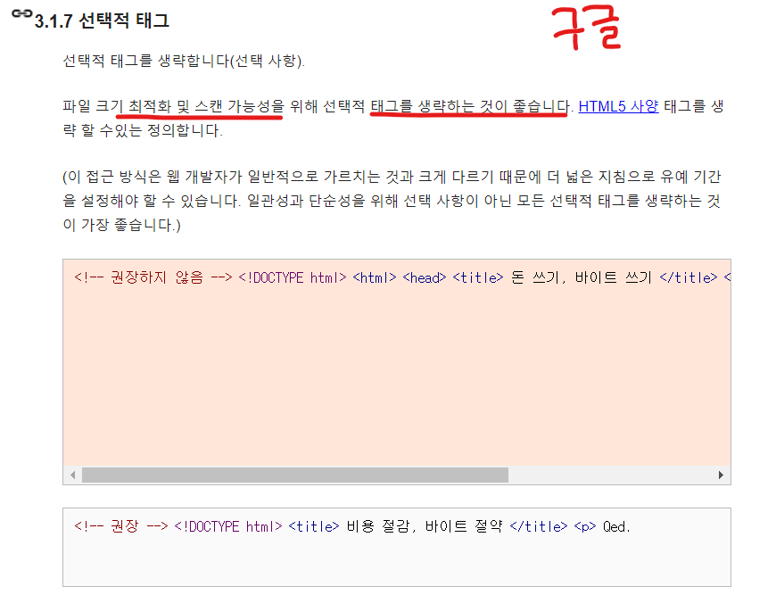 +๊ทธ์น˜๋งŒ ๊ตฌ๊ธ€ ๊ฐ€์ด๋“œ (https://google.github.io/styleguide/htmlcssguide.html#Optional_Tags)์—์„œ๋Š”์ƒ๋žตํ•˜๋ผ๊ณ  ์ด์œ ์™€ ํ•จ๊ป˜ ์•„๋ž˜ ๊ทธ๋ฆผ๊ณผ ๊ฐ™์ด ๋‚˜์™€์žˆ๋‹ค.