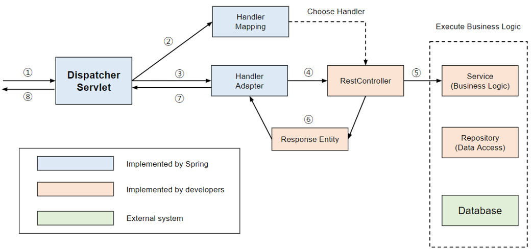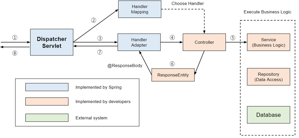 @RestController는 @Controller에 @ResponseBody가 추가된 것입니다. 당연하게도 RestController의 주 용도는 Json형태로 객체 데이터를 반환하는 것입니다. 최근에 데이터를 응답으로 제공하는 REST API를 개발할때 주로 사용하며 객체를 ResponseEntity로 감싸서 반환합니다. 이러한 이유로 동작 과정 역시 @Controller에 @ResponseBody를 붙인것과 완벽히 동일합니다.