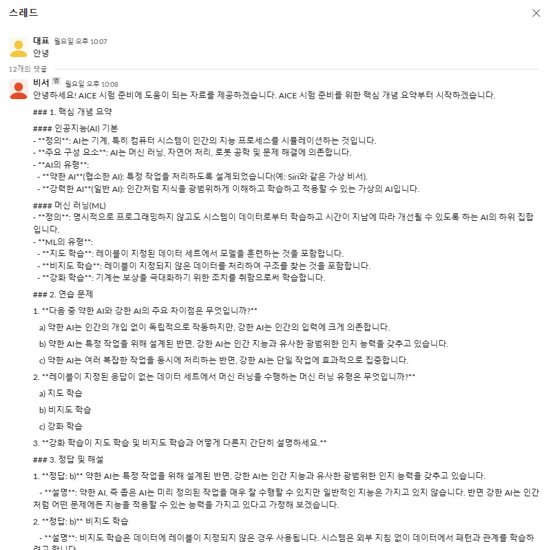 슬랙에 다음처럼 안녕 이라고 하면 aice 챗봇이 댓글을 달아서