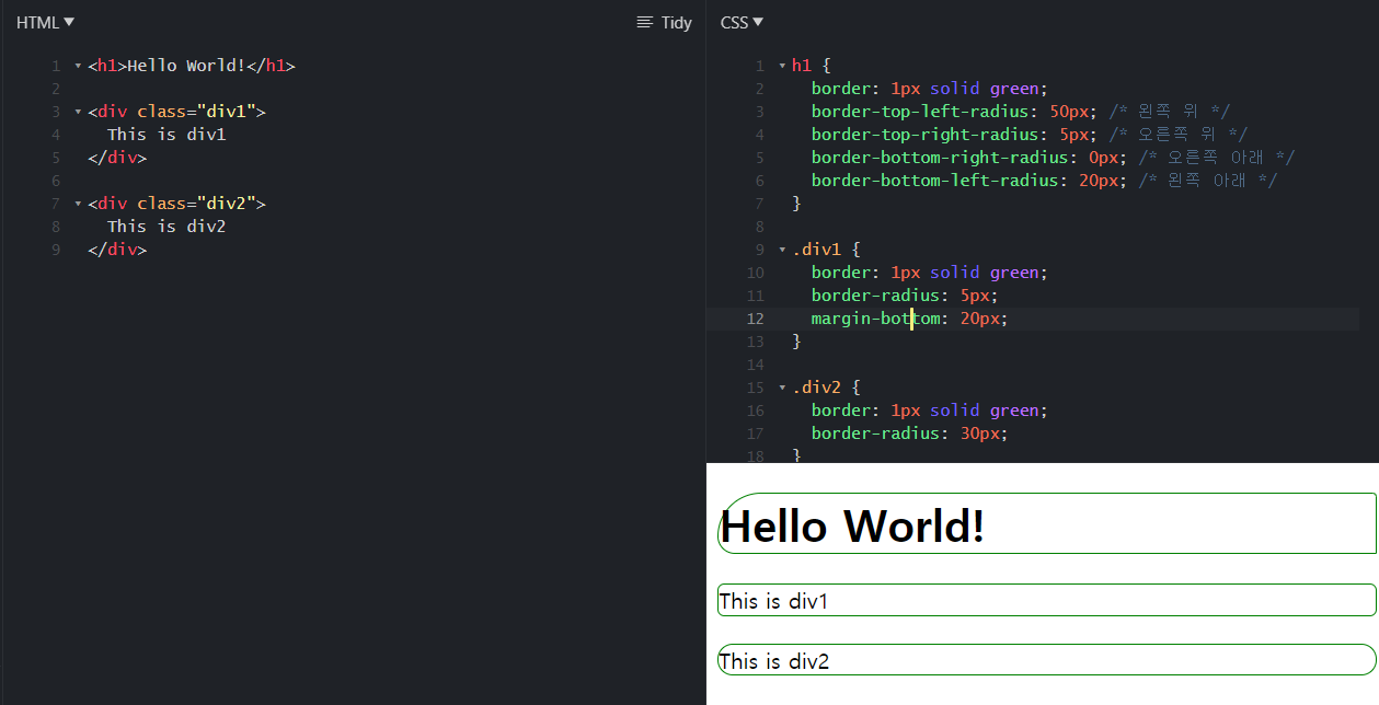 ๊ฐ์ฅ ์ผ๋ฐ์ ์ธ ๋ฐฉ๋ฒ์ border ์์ฑ์ผ๋ก ํ ์ค์ ๋ค ์ฐ๋ ๊ฒ์ ๋๋ค. ์ด ๋ฐฉ์์ ์ฌ์ฉํ๋ฉด ์, ์๋, ์ผ์ชฝ, ์ค๋ฅธ์ชฝ ๋ชจ๋ ๊ฐ์ ํ ๋๋ฆฌ๊ฐ ์๊น๋๋ค. ๊ฐ์ ์ฐ๋ ์์๋ ๊ตต๊ธฐ, ์คํ์ผ(์ค์ , ์ ์ ๋ฑ), ์์ ๋๋ค.