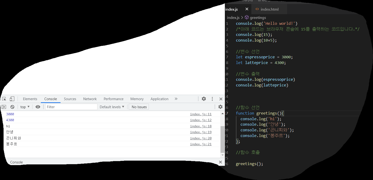 console.log(" ") 이 print 문 처럼 출력하는 명령어 인것 같다.