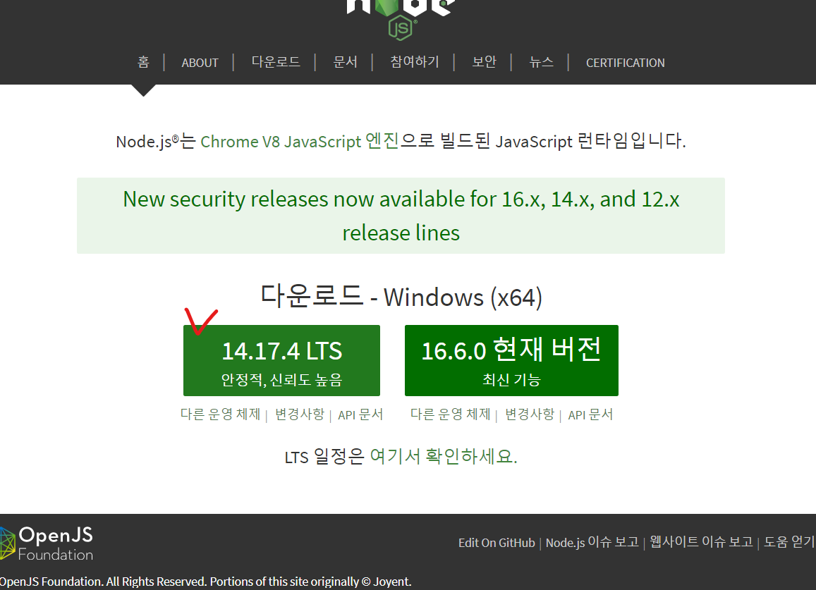node js ์ค์น๋ฅผ ํ๋ ๊ณผ์ ์์ ์ด๋ ๊ฒ ๋๊ฐ๊ฐ ์๋๋ฐ ๋ณด๋ค์ํผ, ์ฐ์ธก์ด ๋ ์ต์ ๋ฒ์ ์ด๊ธด ํ๋, ์์ ์ฑ๊ณผ ์ ๋ขฐ๋๊ฐ ๋ ๋์ ์ข์ธก ์ค์น๋ฅผ ํ๋๊ฑธ ๊ถ์ฅํ๋ค. (ํฌ๊ฒ ์ฐจ์ด๊ฐ ์๋ค๊ณ ํจ.)