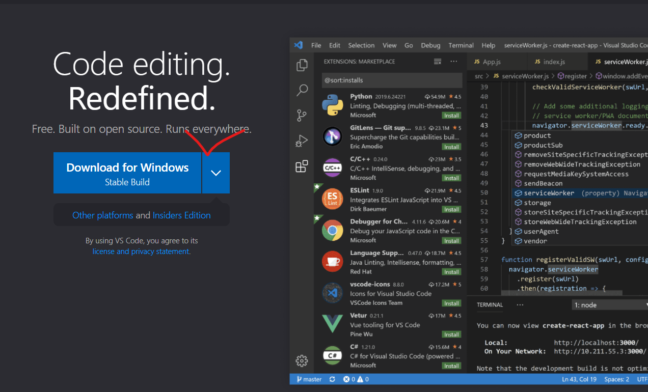 Visual Studio Code is a code editor redefined and optimized for building and debugging modern web and cloud applications. Visual Studio Code is free and available on your favorite platform - Linux, macOS, and Windows.