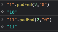 padEnd 는 문자열 1의 길이가 2가 아니면 "0"을 "1"뒤에 적기 => "10" 이 출력된다.