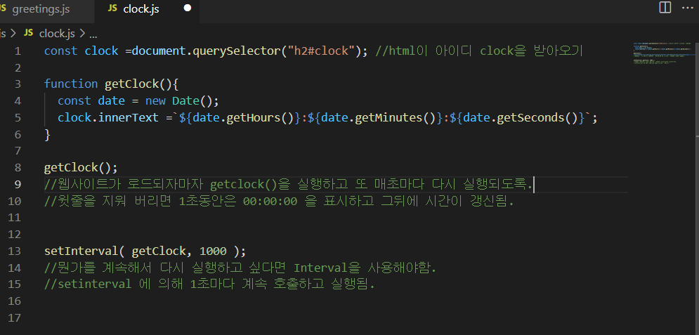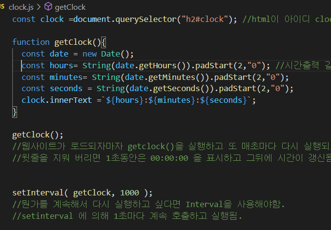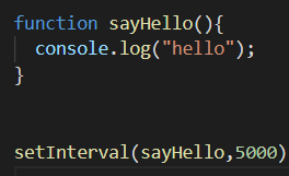 setInterval() 사용법 => 2개의 인자를 받는다. => 1번째는 네가 실행하고자 하는 function => 2번째 인자는 호출되는 function 간격을 몇 ms로 할지 쓰면됨. 그러니까 매 호출 사이에 얼마나 기다릴지 시간을 써주면 됨. --------------------------------------------------------------------------------------------- 마지막줄 코드를 해석하면, 5초 마다 (5000ms) sayHello 함수 실행. 즉, 콘솔창에 5초 마다(간격)으로 hello 문자가 출력된다.