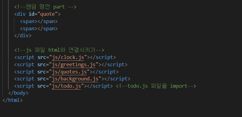 1. div 요소에 아이디 quote 2. 첫번째 span (js 설명할때 첫번째 span 이라고 하는 부분이 이부분임. 첫번째 span 값에는 quote 를 저장한다 했는데 이부분에 quote가 들어가는거임) 3. 두번째 span (그렇다면 이부분은 js 설명할때 두번째 span 이라고 하는 부분인데, 두번째에 들어가게 js에서 설정한대로 author값이 들어가서 출력됨)