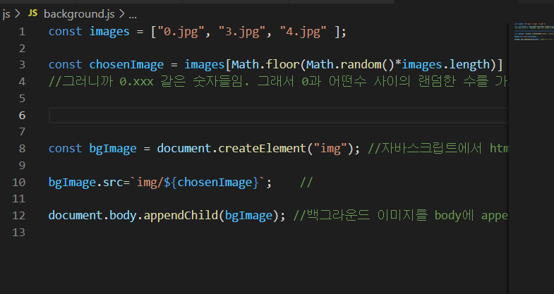 8. 변수 bgImage에 자바스크립트에서 html element 을 만든(생성)것을 저장.