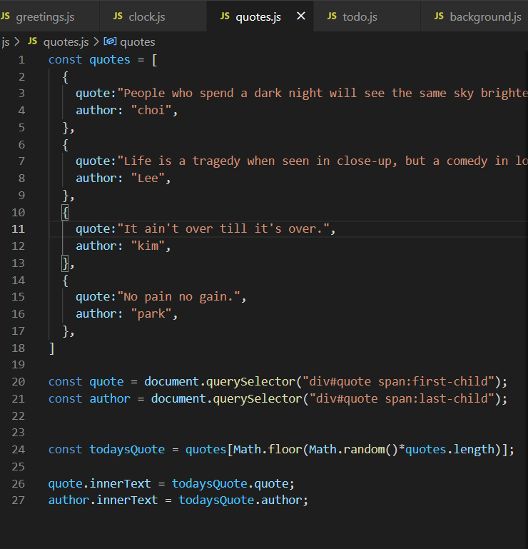 26. quote ( 첫번째 span을 가리킨다고위에서 설명했다. *20번줄) 에다 todaysQuote (quotes 배열에서 랜덤으로 하나를 뽑은 *24번줄에서 설명함)의 quote(명언 값)를 저장해준다.